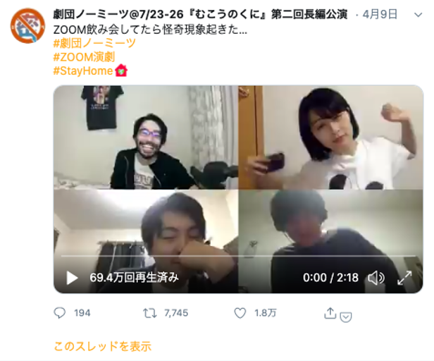 4月9日、新型コロナウイルスの感染拡大で先行きの見えない状況に人々が打ちひしがれていた頃、「ZOOM飲みしてたら怪奇現象起きた...」というテキストと共にあがった2分18秒の動画はTwitter上で瞬く間に拡散され、1.8万いいねがつけられた。突如としてあらわれたエンターテインメント集団、「劇団ノーミーツ」のデビュー動画だ。