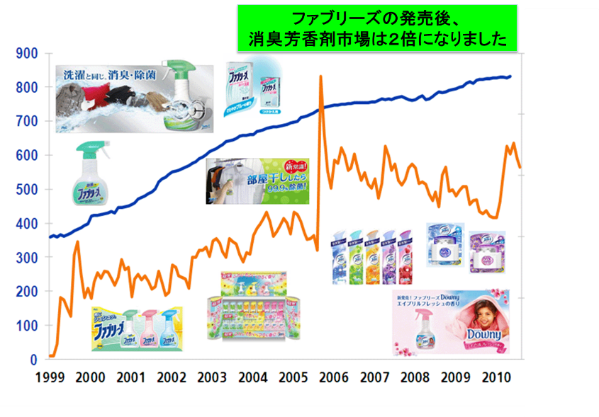 ファブリーズは「布地のニオイをスプレーして取り除く」という、それまで全く存在しなかった「行動」を提言し、その習慣化に成功しました。そして、新しい「行動」が生み出されたことで、ファブリーズの発売から10年間に消臭芳香剤の市場は約2倍に拡大しました。