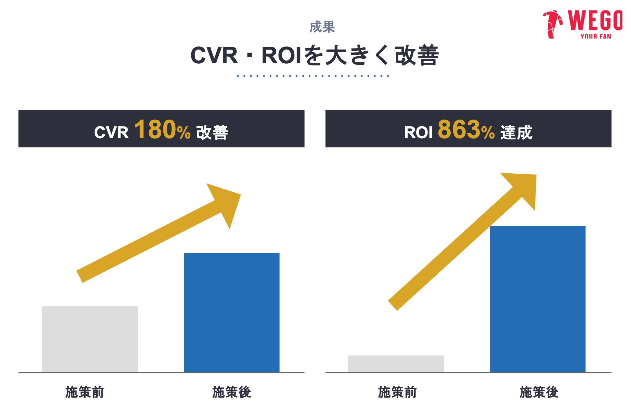 WEGOさんの課題は、社内に人材とノウハウが足りずに、施策を十分に回せないことでした。そこで私たちのチームが支援に入ることで、年間200本以上の施策を打ち出すことができ、その結果、CVRが1.8倍、ROIが860%と劇的な成果を上げることができました。