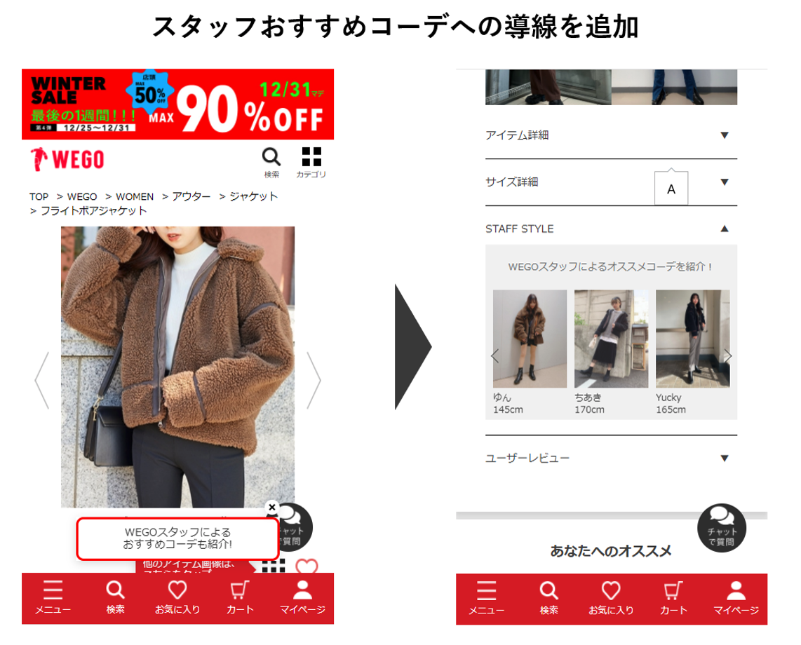 このように成果が出た施策のひとつに、「スタッフのコーディネートをWebサイト上でうまく見せる」というものがあります。WEGOさんの実店舗にはカリスマ店員と呼ばれるようなスタッフさんがいらっしゃいます。その店舗スタッフのオススメコーディネートをWebサイトで紹介することで、彼らの店舗でのエンゲージメントをWebでも最大限に再現でき、今回の成果につながりました。