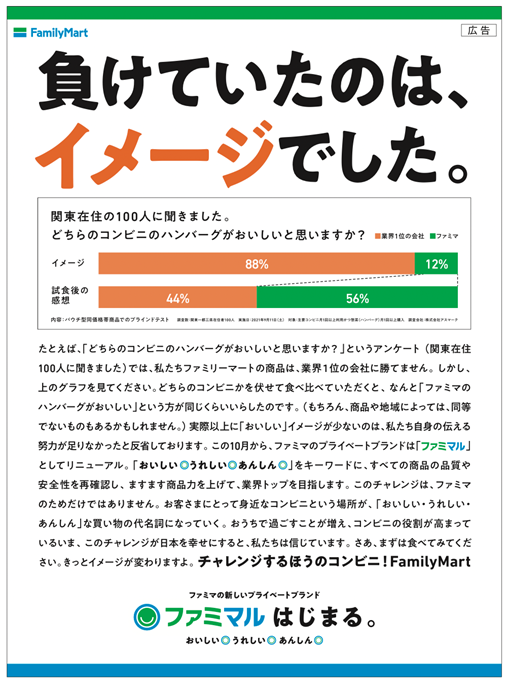 ファミリーマートは、新プライベートブランド発表会を開催した18日、「負けていたのは、イメージでした。」というコピーが掲載された新聞広告を掲載。「(業界1位のコンビニとファミマ)どちらのコンビニのハンバーグがおいしいと思いますか?」という質問に対する、イメージと試食後の感想の差を打ち出した。