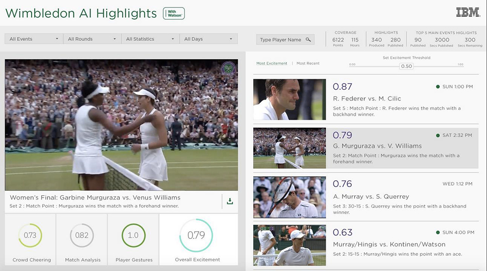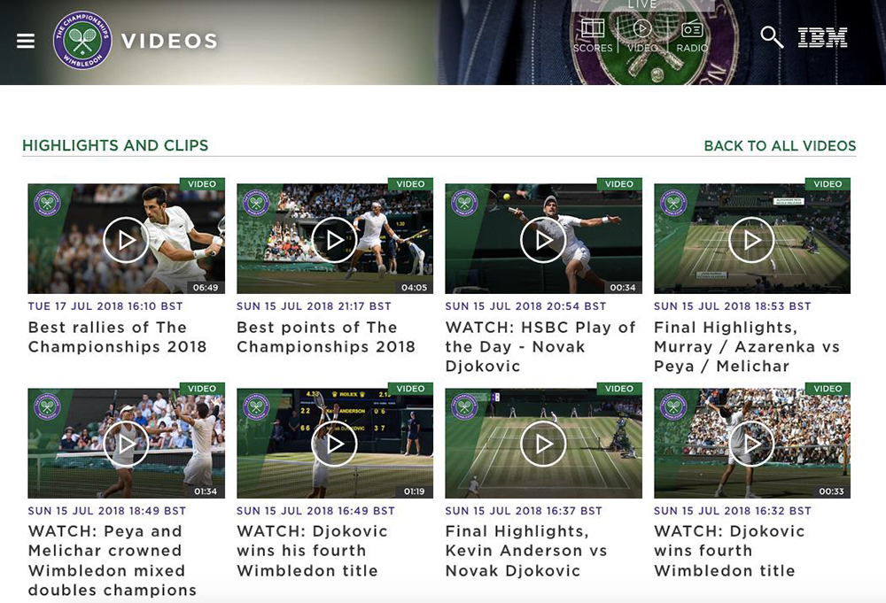 また、特設サイトである「Wimbledon.com」内では、ハイライト映像が試合終了後わずか5分以内で公開されている。「IBM Watson」によって開発されたシステムが、3時間を優に越える5セットマッチを観戦し、あらかじめ学習しておいた「エキサイト」なシーンを抽出・サムネイル化し、デジタルコンテンツ編集者がマッシュアップしてハイライト映像を作成する。従来50分ほどかかっていた編集作業が、わずか5分に短縮され、完パケされるのである(※注目度の高い6面のコートで採用している)。