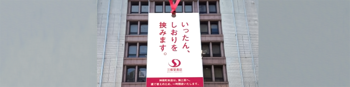 そんな読書体験や書店体験の総本山とも言える「三省堂書店神保町本店」が、ビル建て替えのため、2022年5月から2025年まで一時閉店することになりました。その閉店の時に本店ビルに掲出されたのが、「いったん、しおりを挟みます」と記された巨大しおりです。