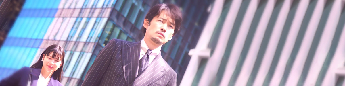 おなじみ竹野内豊さん扮するベテラン・サラリーマンの「あっついなぁ」の一言で、CMは始まります。もちろんジャケットは脱いで、手に持っています。ふと振り返ると同行している後輩女性(石井杏奈さん)は、ビルの壁に沿うように歩いています。