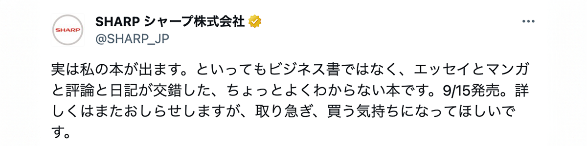 現在、83万フォロワー超の人気を博しているSHARP(シャープ)のX(旧Twitter)公式アカウント「SHARP シャープ株式会社」。2011年5月にアカウント開設以来、12年間にわたって“中の人”をつとめる「シャープさん」が、シャープマーケティングジャパン デジタルマーケティング部の山本隆博氏になる。2023年9月に初の単著となる『スマホ片手に、しんどい夜に。』を出版した。今回はSNS運用において山本氏が大切にしている考えやスタンスについて詳しく聞いた。