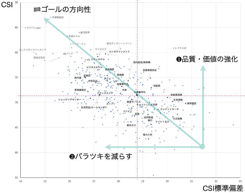CSIは、企業ごとに独自に調査し、スコアを算出するほか、競合他社との比較のために業種単位で算出する方法が一般的によく用いられている。それに対して、このJCSIのように異業種・業態を横断して横串で比較するCSIを用いることによって、どのブランドないしは業種・業態がどの程度、顧客ニーズを満たしているかを比較できる。 グラフの横軸には、CSIの標準偏差を表している。たとえば、CSIが70点であったとしても300人の回答者すべてが70点の評価をしているとは限らず、一定のバラツキで分布しているのが一般的である。このバラツキの大きさを標準偏差で表している。