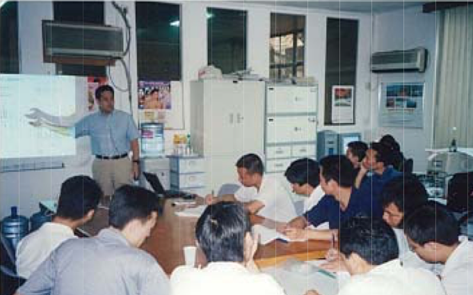 中国駐在中、新製品について現地の営業マンに説明する中島氏(左上)
