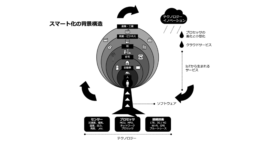 2016年に私が描いた「スマート化の背景構造」の図では、革新的な顧客体験を創出する構造を示しました。この図では、センサーやプロセッサ、通信技術といった基盤技術が、ソフトウェアや顧客サービスのレベルを底上げすることが示されています。