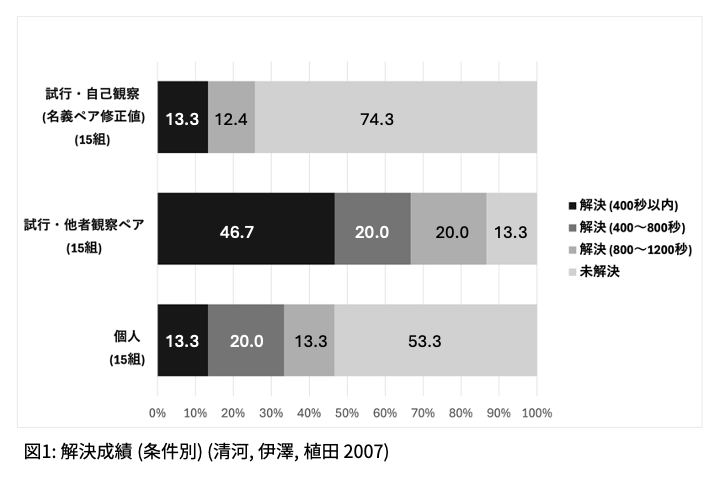 その結果、「他者観察条件」が「個人条件」や「自己観察条件」よりも短い時間で正解にたどり着きました。