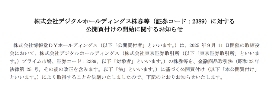 なお、デジタルHDは9月11日の取締役会で、TOBが成立することを条件に、連結子会社であるバンカブルの解散、清算を実施する方針を決議した。