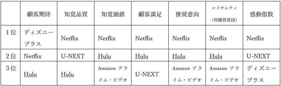 JCSI調査は、3ヵ月以上の利用経験などのスクリーニング条件を満たした回答者を、調査会社のモニターからサンプリングし、各社300件以上の有効回答を得た調査結果をもとに、顧客期待から感動指数までのスコアを100点満点で算出している。JCSI調査は、サービス産業を広く調査対象としており、他業種と同じ計算方法でスコアを出している。顧客満足で1位のNetflixのスコアは74.1であるが、エンタテインメント分野の宝塚歌劇団は82.5、劇団四季は81.4、東京ディズニーリゾートは78.3である。「楽しい」「嬉しい」「感動した」「興奮した」などといった感情体験がどれくらいあったかをスコア化した感動指数については、Netflixは60.7であるが、上記3つのエンタテインメント上位は75~76点であり、スマホなどの画面上でコンテンツを体験する動画配信サービスは、劇場やテーマパークでの実体験の顧客満足度に比べると、カテゴリー全体としてやや低い傾向があることがわかる。