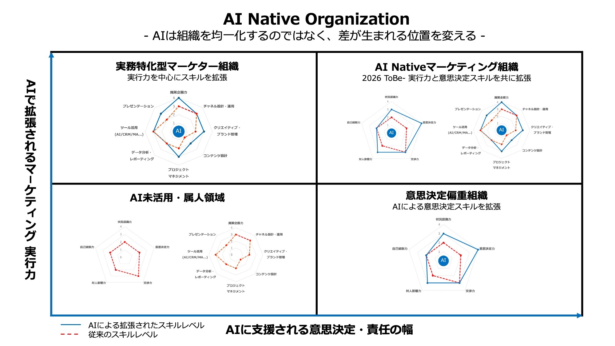 2026年に問われるのは、AIを導入しているかどうかではありません。四象限が示すように、どのスキルをAIで拡張し、意思決定のどこを人が担うのか。その設計と運用を、経営と現場がどう共有し、実装できているか。その設計思想こそが、AI時代のマーケティング組織の競争力となるでしょう。