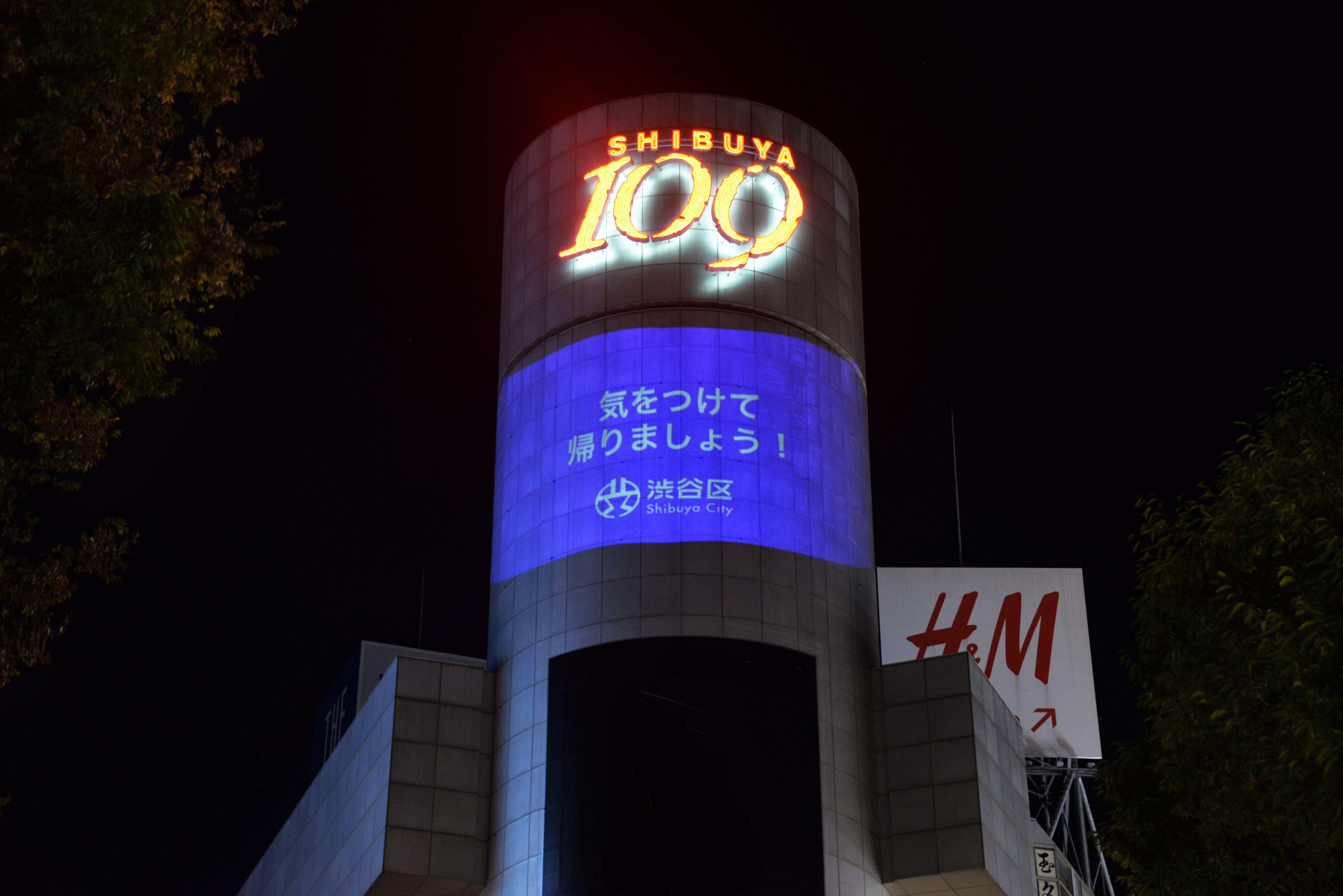 私たち組織のハロウィーンによる取り組みは、ゴミ拾いだけではなかった。NTTドコモから技術提供を受けて、10月31日22時から渋谷109の壁面にプロジェクションマッピングを行い、駅前混雑時の注意喚起・情報提供の共同実証実験を行った。今後のための取り組みのひとつで、多くの参加者に適切な情報を伝え、駅前周辺の混雑や事故の防止へとつなげることが目的であった。実験としては成功したが、これを今後どう活かすかはこれからの検討事項である。