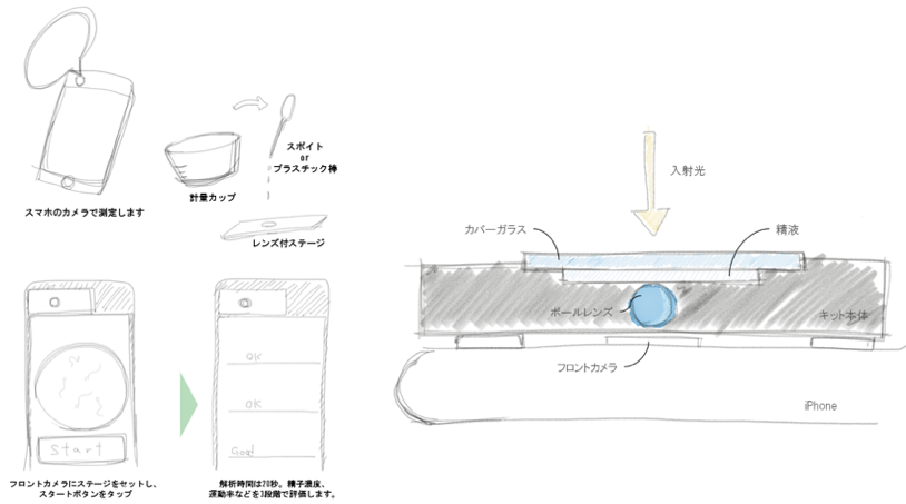 上司との会話の翌日、早速ラフスケッチに取り掛かりました。精子を観察するためのレンズには、どのような機構が必要か。実験の経験や医学の知識がない一般の人に使いやすいキットとはどのようなものか。スマートフォンで動画解析を行うために、スマートフォン本体と顕微鏡レンズの構成はどのようにすべきかなど、検討すべき項目は多岐に渡りました。