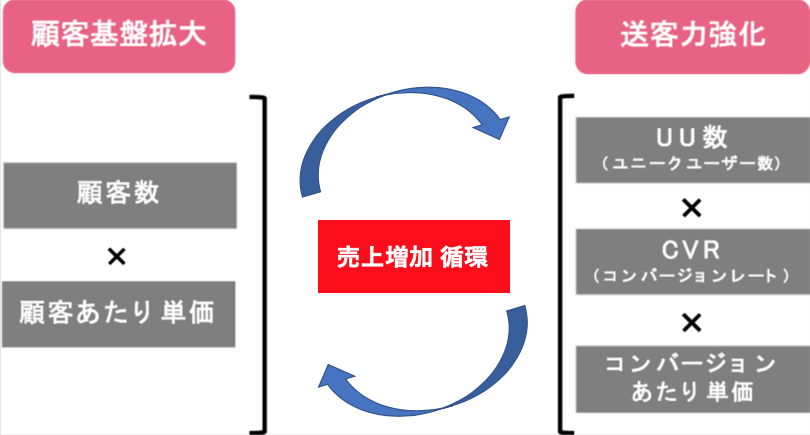 具体的な売上収益のKPIですが、顧客基盤拡大では「顧客数」と「顧客基盤単価」、送客力強化では、「UU(ユニークユーザー)数」「CVR(コンバージョンレート)」「コンバージョンあたりの単価」となっています。これらの指標を上げていくことで、売上収益も上がるという仕組みです。