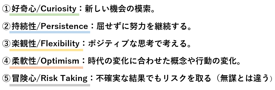 そのため、クランボルツ教授は好奇心、持続性、楽観性、柔軟性、冒険心の5つの行動方針を提唱している。