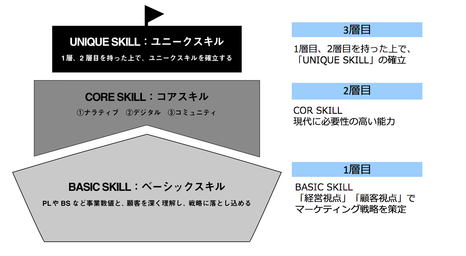 船の一番下に持ってきたのは、この能力がなければ、他にどのような能力があっても、いずれかのフェーズで通用しなくなるからです。そういう意味もあり、船を動かすエンジン部分に、一番大切な「経営目線」を置いています。またマーケターとして必須のユーザー理解も経営目線と合わせてBasic Skillですね(最近の船は、下にエンジンがない場合があるというツッコミはご容赦ください。あくまで例と思ってください)。