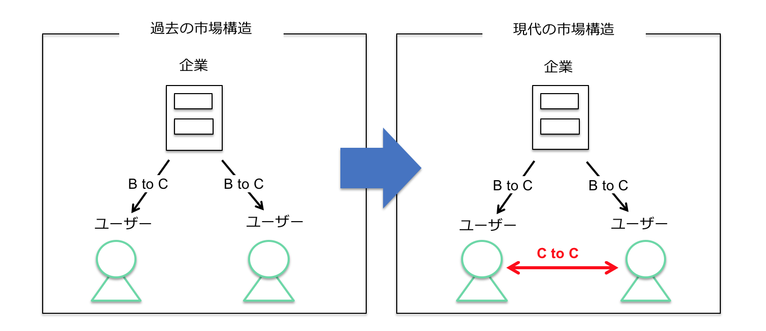 左の図は、昭和から平成前半までの市場構造です。インターネットが普及するまでは、大企業がテレビCMや新聞広告で告知する商品・サービスが良いものとして認識されていました。