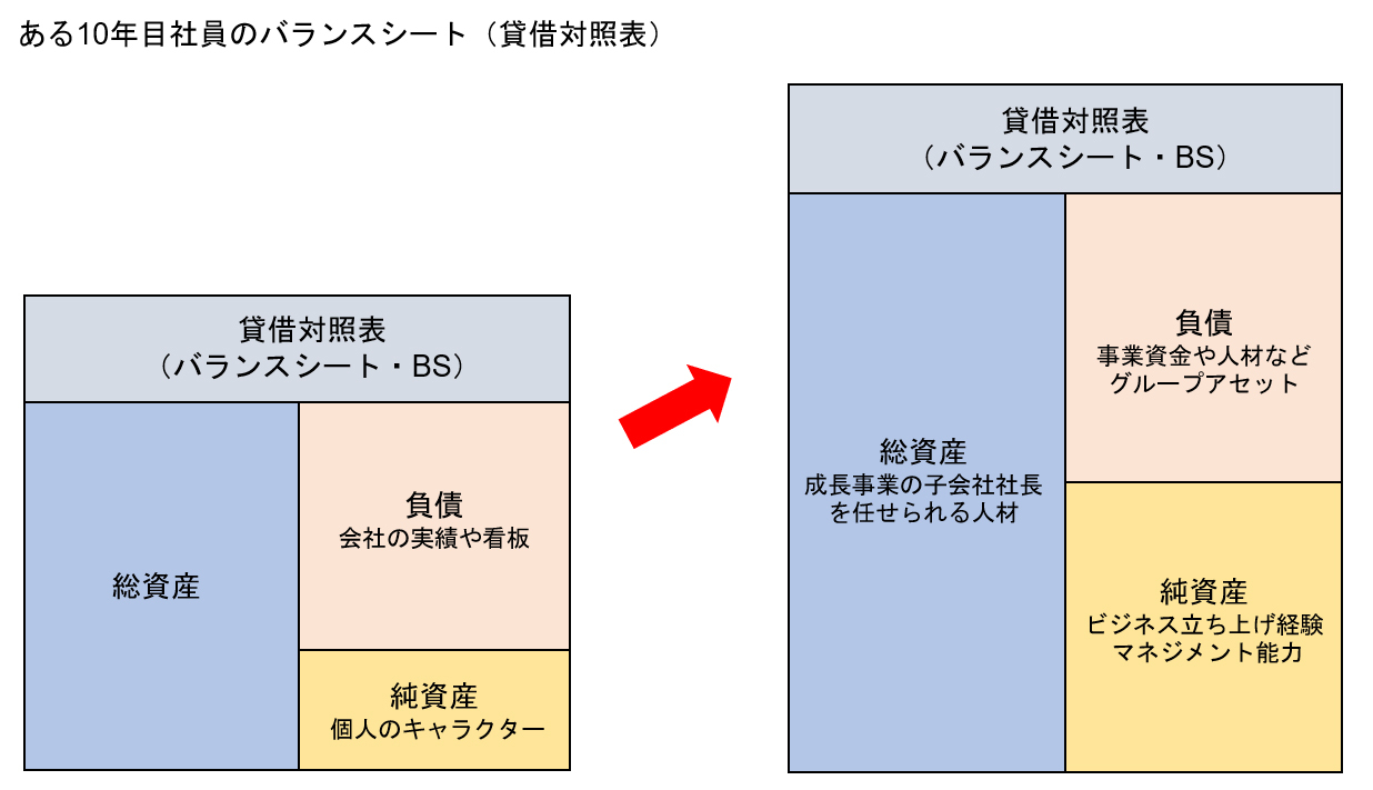 その頃から、彼は頭の中にBSを持っており、自分が成長するためには、会社から「挑戦できる環境」を負債として借り入れなければ、純資産も大きくならないということに気づいていました。そこで自ら、海外赴任を志願することで、うまく会社から負債を引き出し、純資産を増やしていきました。