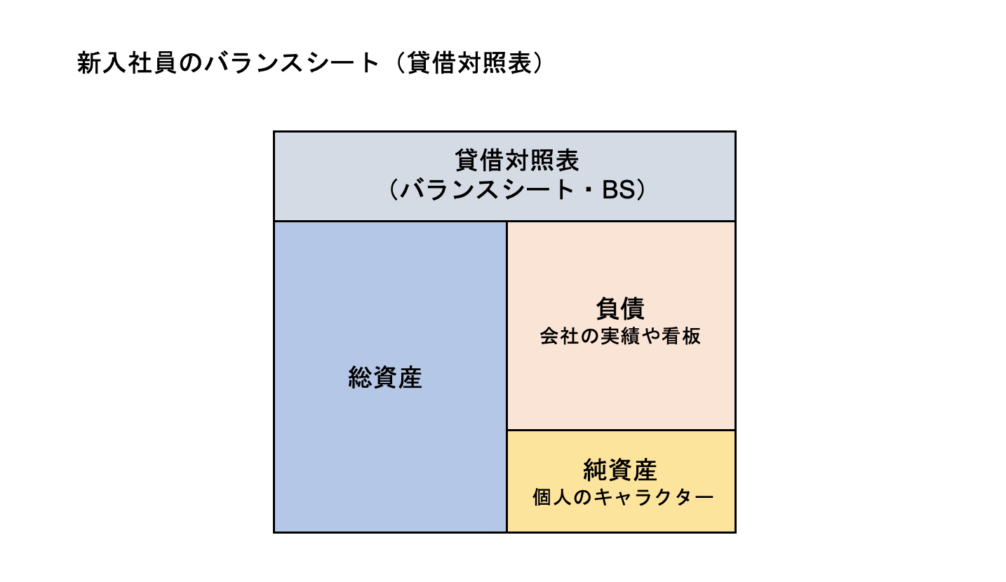 この負債は1年目の社員であれば、全員同じです。ただし、純資産の大きさは人それぞれでしょう。この負債と純資産の合計が総資産になるため、それぞれが純資産を増やす努力をすると同時に、さらなる負債を借りられる人間になることで、総資産を増やしていくイメージです。