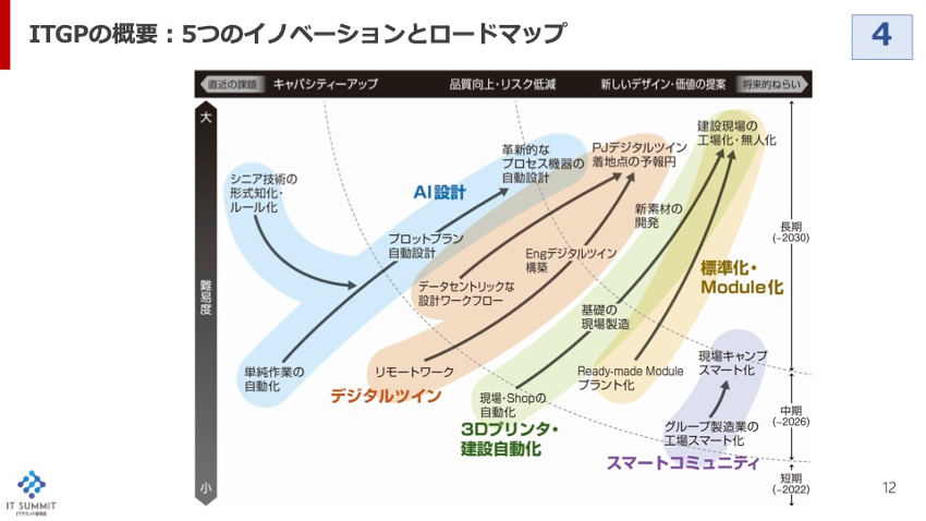 その中でチームに分け、それぞれに「AI設計」、「デジタルツイン」、「3Dプリンタ・建設自動化」、「標準化・Module化」、「スマートコミュニティ」などのテーマを設けてプランを作成していきました。最終的に100枚ほどのグランドプランに成りましたが、それが1枚のロードマップにまとめられ、これが本当によく仕上がっていて、作成から4年経った今でもまったく修正していません。