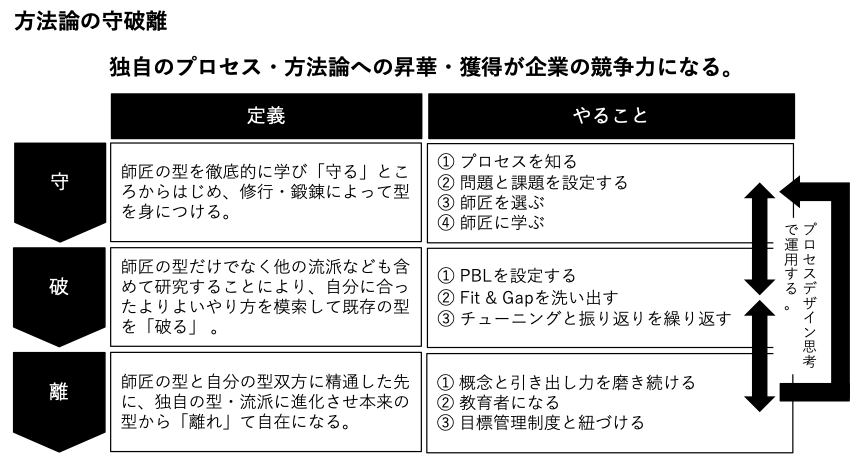 次に「破」の段階では、プロジェクト型学習(PBL)などを導入し、既存のやり方が自社にフィットするかを検証し、カスタマイズする必要がある。企業ごとに業態やカルチャー、リソースが異なる以上、外部の型をそのまま適用することは難しい。むしろ菅氏は、自社の特性に応じて“破り方”を見極め、試行錯誤を経て最適なやり方を模索していくプロセスこそが重要だと指摘する。