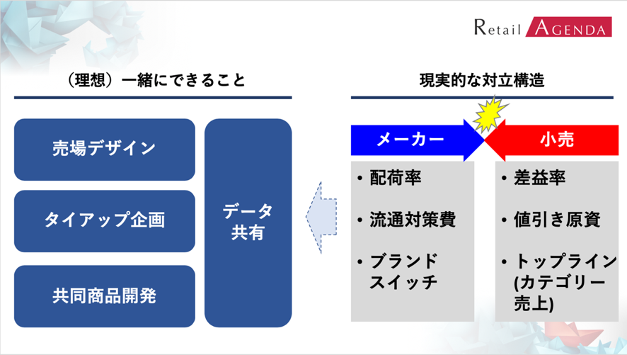 その状況があることを念頭に置きつつ、「メーカーとリテールの連携には、どのような可能性があるか?」をまとめたのがこちらのスライドです。