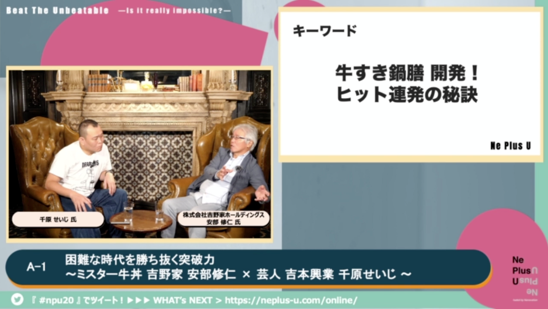 吉野家の高卒アルバイトから正社員になり、頭角を現す中で倒産を経験。その後、社長に就任するも米国BSE問題に直面。主力商品が販売できなくなる期間を乗り越えて、同社の成長を牽引してきたのが吉野家ホールディングス 会長の安部修仁氏。現在のコロナ禍における困難な時代をどう捉えているのか、そして企業が難局を乗り越えていくためには何が大事になるのか。安部会長のこれまでの歩みを聞きながら、探っていく。聞き手を務めるのは、吉本興業所属の芸人で物怖じしないコミュニケーション力で知られる千原せいじ氏。これまでにない組み合わせから「困難な時代を勝ち抜く突破力」に迫る。