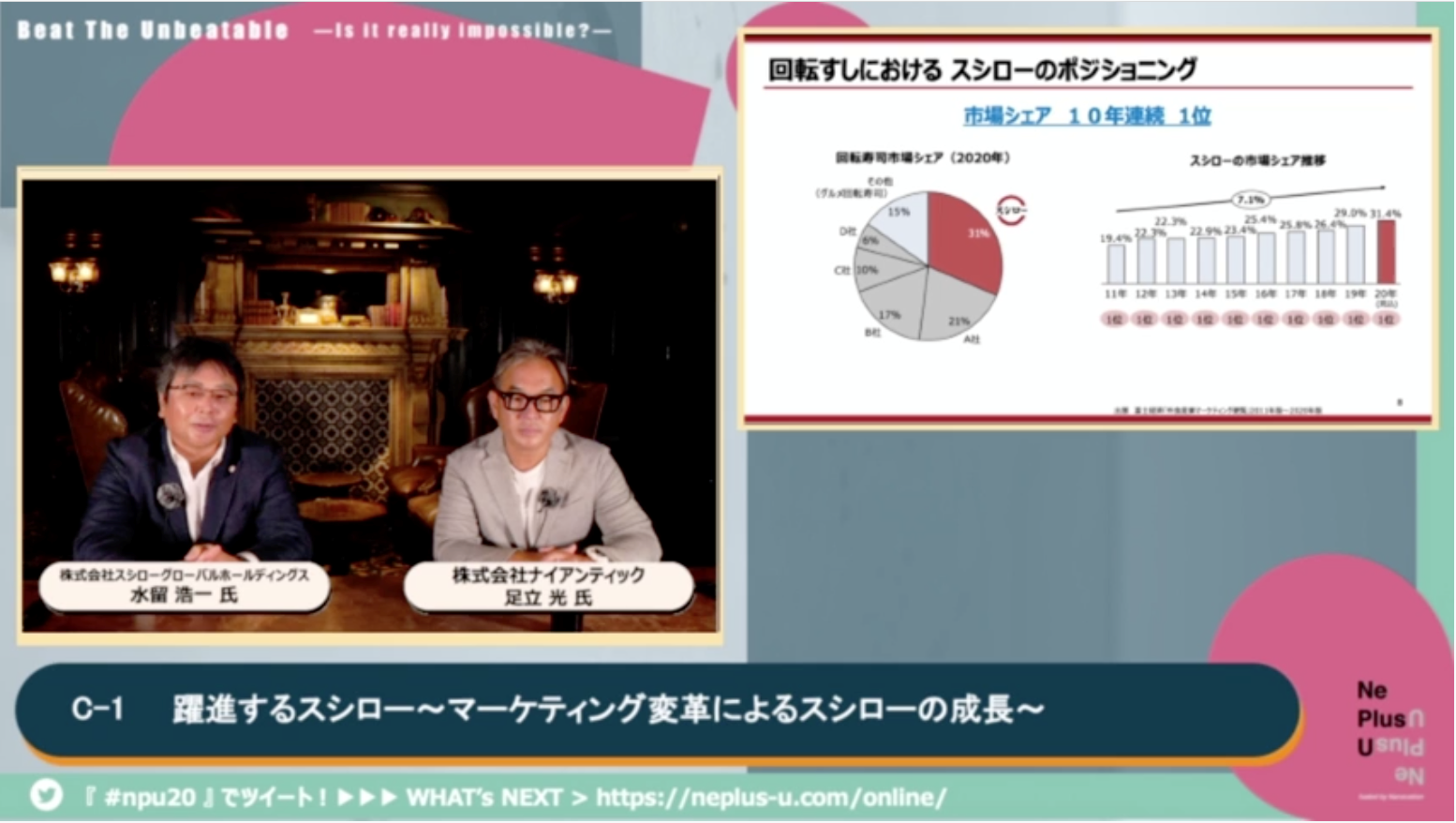 6000億円を超える国内の回転寿司市場でトップを走るスシロー。売上高でも営業利益でも、競合企業に差を付けている。2015年の社長就任以降、この状況をさらに盤石にしたのが、スシローグローバルホールディングス 代表取締役社長 CEO 水留浩一氏。就任以降、マーケティングとして取り組んだのが、美味しさのさらなる追求と、待ち時間の解消につなげるアプリなどデジタル活用。その結果、顧客満足度は上昇し、さらなる売上増加につなげている。今回のセッションでは、外資系コンサルティング会社であるローランド・ベルガーで共に働いた経験を持つ、ナイアンティック シニアディレクターの足立光氏が聞き手を務めて、水留氏のキャリアとスシローでの取り組みを振り返りながら、近年の成長の裏側にあったマーケティング改革に迫る。