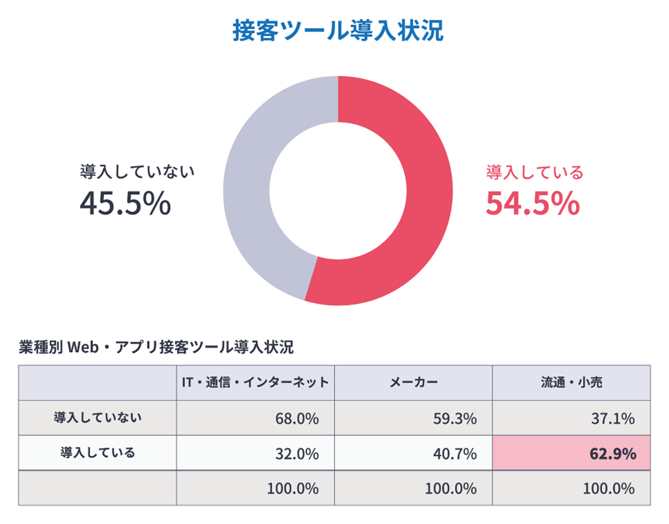 調査結果によると、Web・アプリ接客ツールを導入している企業は、54%と約半数。業種で見ると、顧客とのコミュニケーションの頻度が高い「流通・小売業」が多かった。