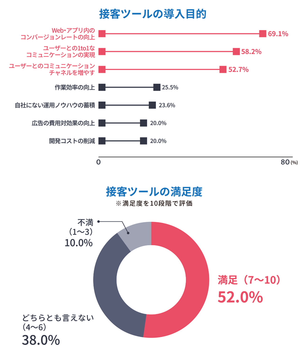ツールを導入する目的として、約7割の企業があげたのは「Web・アプリ内のコンバージョンレート改善」。次いで「1to1コミュニケーションの実現」、「ユーザーとのコミュニケーションチャネルの増加」が多かった。導入後の効果については、導入企業の約半分が「満足している」と回答している。
