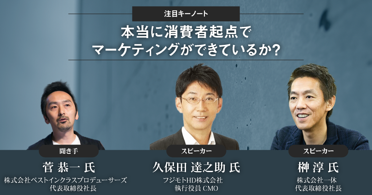 そこで、消費者起点でビジネスを成長させている、一休の榊氏、フジモトHDの久保田氏をお招きし、「消費者起点のマーケティング」をテーマに、マーケティングの真髄、本質を語っていただくセッションです。
