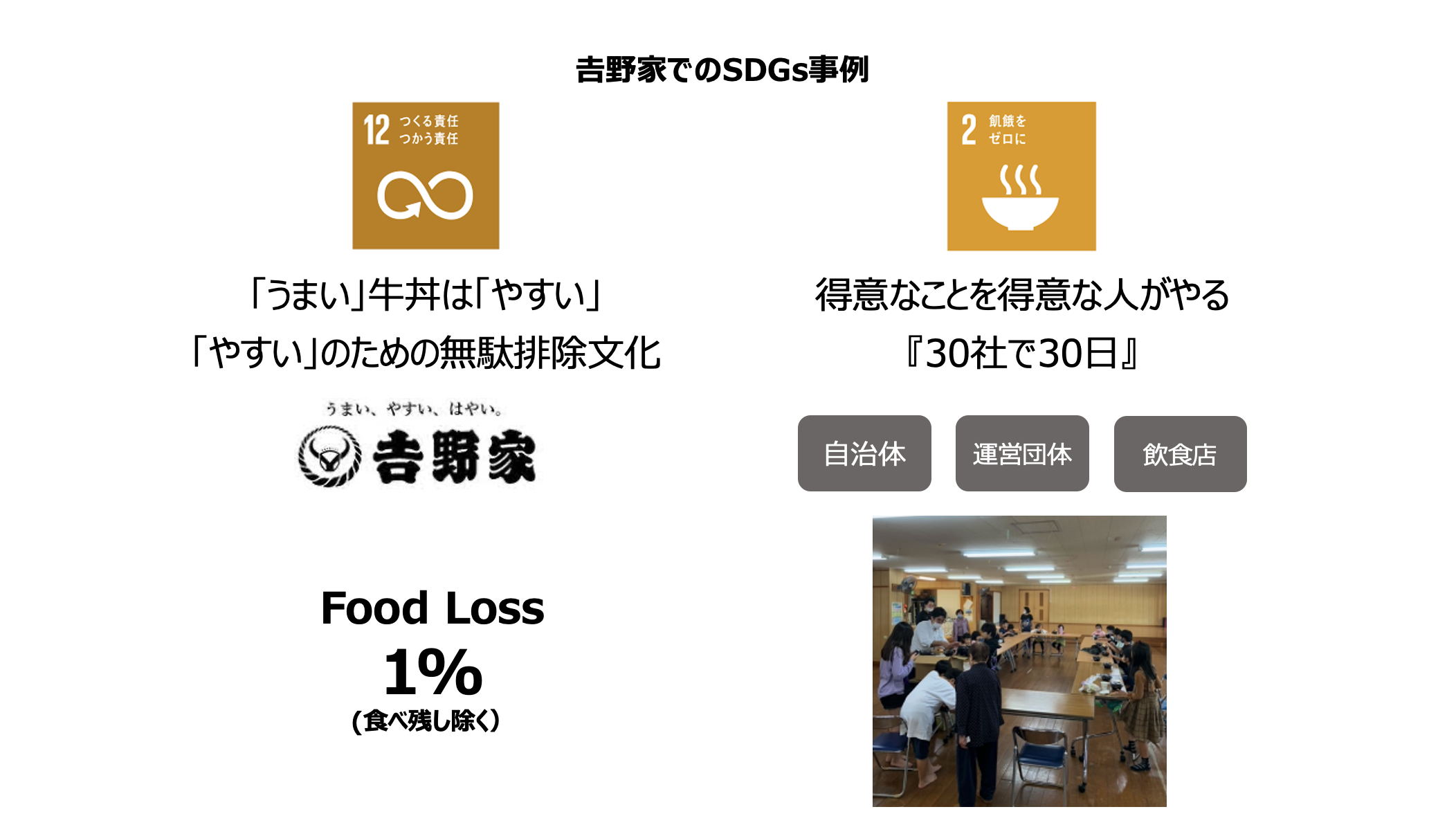 吉野家は「うまさ」「やすさ」が大事な取り柄です。多く煮過ぎて余ったものはロスになり、ROIが悪くなるとどんどん旨味が溶けておいしくなくなります。つまり、無駄をなくすと「やすく」、「おいしく」なり、自然とフードロスの解決になるといいます。SDGs的にいうと8~10%のフードロスが業界平均ですが、吉野家は1%という数値を当たり前のように達成しています。
