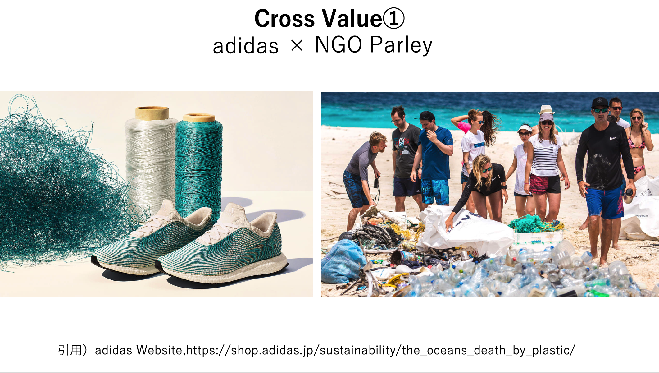 「前から横から単なるデザインを見られるだけではなく、横から後ろから裏に隠された物語まで見られるようになり、社会の目が買い手と売り手を「この人、adidasのParley履いてるから、サステナブルに興味あるんだな」と見るようになります。