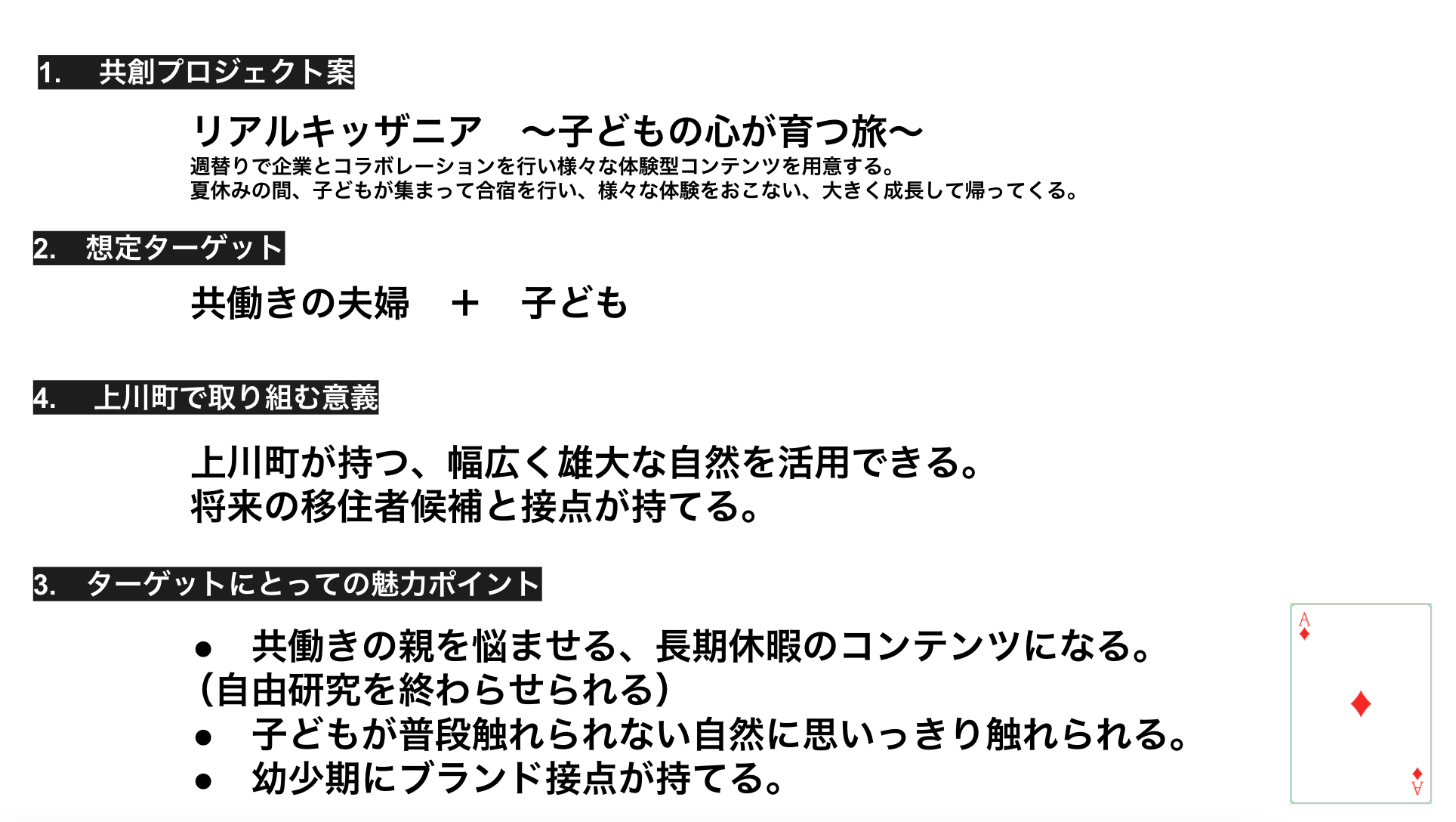 夏休みに共働きの親を持つ都市部在住の子どもたちに上川町に来てもらい、観光だけでなく自由研究を進めながら自然をフル活用した原体験を積んでもらえるプロジェクトです。毎年、親は長期休暇になると子どもに何を体験させればいいか悩みます。そんな親子に向けて、上川町は最高の体験を提案します。さらに、幼少期という限られた期間にブランドとの接点を持てる機会は、協賛企業にとって魅力的なはずで、週替わりで一次産業体験や自然体験をすると良いのではといった意見が出ました。