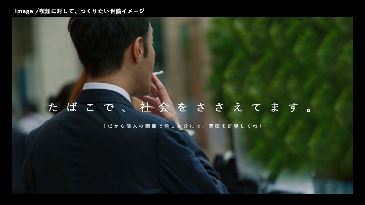 喫煙所やパッケージ、Webに納税の感謝と賞賛のタグラインを掲載することや、確定申告で納税意識が高まる時期に喫煙者を「2兆円」高額納税者としてPR(高額納税ランキングや長者番付にランクイン)するアイデアです。この施策により、喫煙に対して「たばこで、社会をささえています」という世論イメージを形成し、個人の範囲で愉しむ喫煙は、喫煙を許容してほしいという狙いがありました。