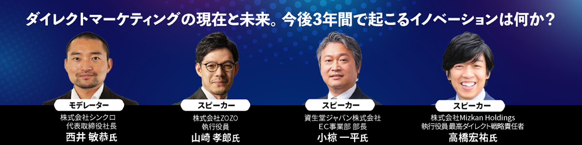 ダイレクトアジェンダの人気キーノート企画「ダイレクトマーケティングの現在と未来。今後3年間で起こるイノベーションは何か?」が、今年で6年目を迎える。登壇者には、ZOZO 執行役員の山崎孝郎氏、資生堂ジャパン EC事業部 部長の小椋一平氏、Mizkan Holdings 執行役員 最高ダイレクト戦略責任者の高橋宏祐氏の3人が決まった。モデレーターは、シンクロ 代表取締役社長の西井敏恭氏が務める。最前線で活躍する企業のビジョンと施策を分析し、その共通点や相違点を導き出しながら「コロナで顧客の心理や購買行動はどのように変化したのか」、「ライブコマース、メタバース、SDGsなどのトレンドの捉え方」、「3年後を見据えて、これから取り組むべきこと」を考える。