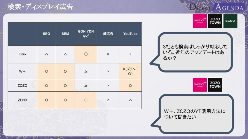 「YDN・GDNはcookie規制の問題以降、リターゲティング中心に実施している企業は厳しくなっているが、OisixやZENBさんのようにサンプルやお試しを実施している企業は変わらず活用できています」と、シンクロの西井敏恭氏は言います。YDN、GDNは各社かなり効率が厳しくなっているとのことですが、サンプル購入や読み物コンテンツを読ませてリードを獲得するという使い方では有効とのことです。