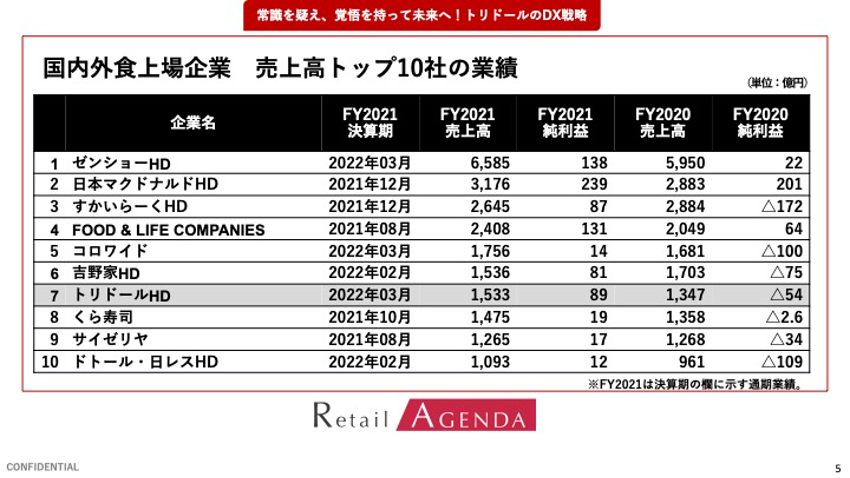 磯村 まずは「国内外食上場企業 売上高トップ10社の2020年・2021年の業績」についてです。外食業界はコロナ禍で非常に厳しい状態にあり、2020年度はトップ10社中7社が赤字でした。トリドールHDも2020年4、5月の売上は半分に減ってしまい危機的な状況でしたが、それをきっかけにDXが加速しました。2021年度にはトップ10社とも黒字化していますが、どのように挽回したのか。国内外食トップ企業の特徴を見ていきたいと思います。