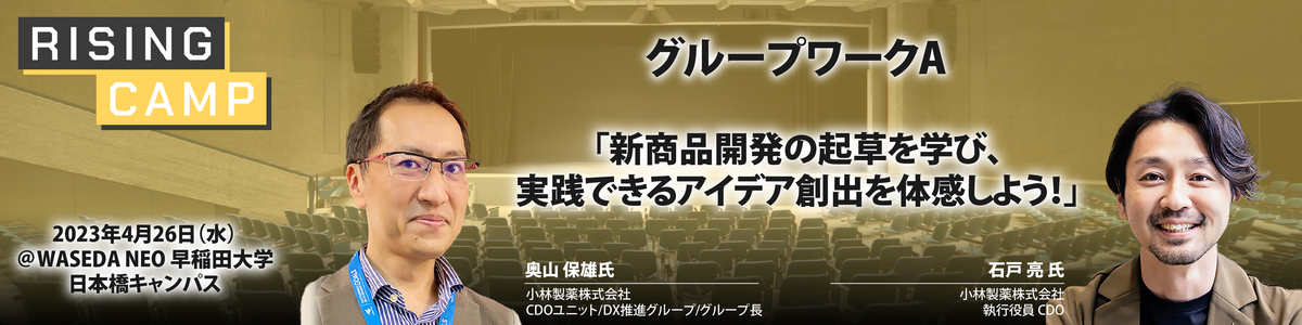 プログラムのひとつとして、グループワーク「新商品開発の基礎を学び、実践できるアイデア創出を体感しよう!」の実施が決まった。小林製薬 執行役員 CDOの石戸亮氏と、CDOユニット/DX推進グループ/グループ長の奥山保雄氏が登壇し、商品開発の基礎である①顧客志向②コンセプト③アイデア創出④ネーミング・PKGなどを教える。さらに、コンセプトやポジショニング、失敗商品の売れなかった理由などを考えながら、頭の体操をする内容になっている。後半はチームに分かれて、実際にアイデア創出を行うワークショップにも取り組み、最後はプレゼンテーションを行う。