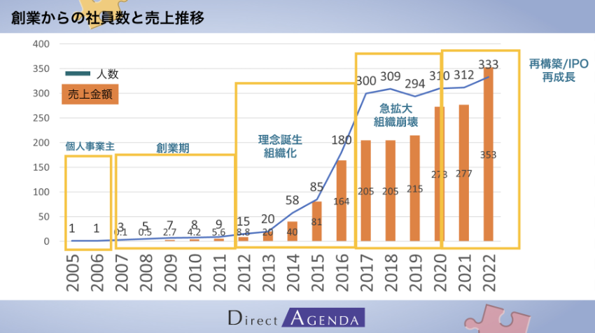 伊藤 グラフの通り、2015年から2017年にかけて、BOTANISTの売上が急速に伸び、それに伴い社員数も急速に増やしてしまった影響で組織が崩壊してしまいました。スキル重視の中途採用で、企業理念が行き渡らず、成果のみに視点がいきすぎてしまった結果です。
