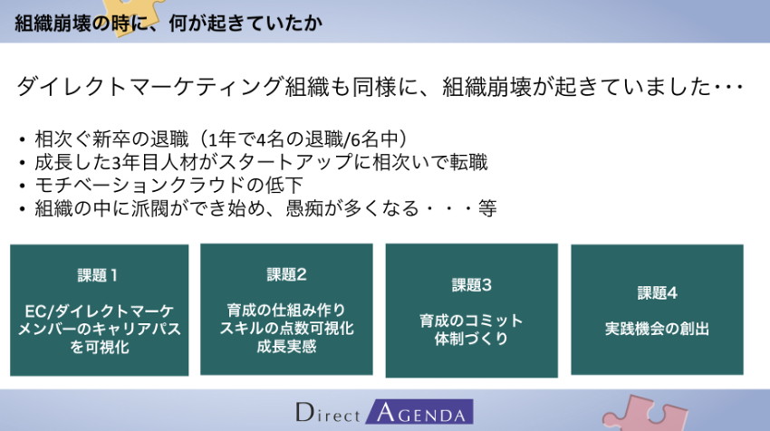 私が管轄していた、ダイレクトマーケティング組織も同じ時期に崩壊してしまいました。モチベーションの高い新卒3年目がスタートアップ企業へ転職するなど、社員全体の士気も低下していました。