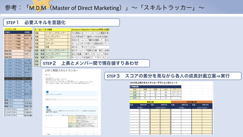 伊藤 大きく4つの課題がありましたが、総合すると「メーカーでダイレクトマーケティングを担当していることは、キャリアの先行きが不安だ」ということでした。この課題を解決するために、キャリアパス、評価、育成、実践を総合的に取り入れた独自の育成プログラム「M.D.M(Master of Direct Marketing)」の運用をスタートしました。