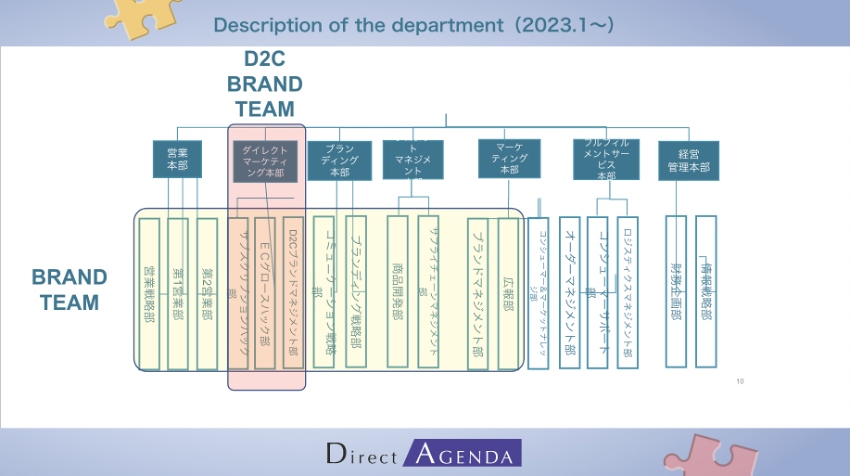 D2C領域に関しては、ダイレクトマーケティング本部にすべての権限があり、D2Cブランドも独立して開発や販売を行っているとのことでした。