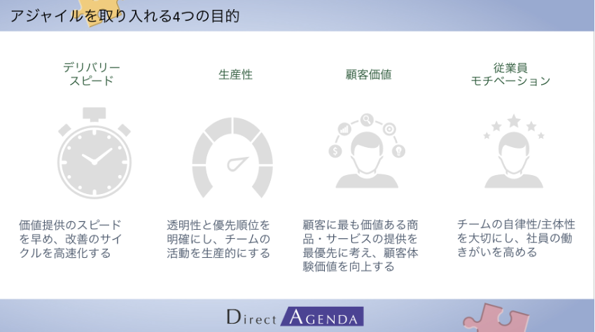 結果的に、デリバリースピード、生産性、顧客価値、従業員モチベーションの4つのメリットが生まれます。