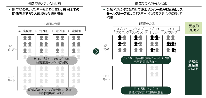 佐々木 はい、スプリントプランニング(スプリントのゴールを話合い、そのゴール達成のために必要な作業計画を立てるイベントのこと)を徹底することで、無駄な会議への参加がなくなったので、コアメンバーは業務に集中することができるようになり、当事者意識が高まったという評価があります。