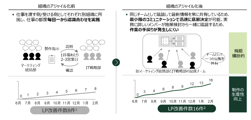 アジャイル組織の形成は、変化する顧客の声を聞き、徹底的に顧客価値を追求することで、顧客のニーズに応える商品やサービスを提供できます。また、意思決定のスピードが遅く責任範囲がわかりにくい“大企業病"から脱却し、デジタルプレイヤーのスピードに対抗できる機動的な業務運営を実現することが狙いでした。