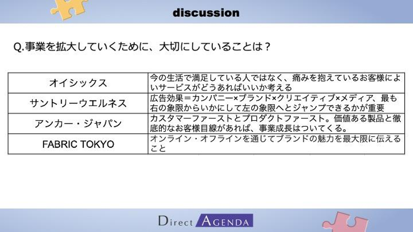 セッションの冒頭では、毎年恒例の「各社のWebマーケティングや広告出稿状況」についての話がありましたが、例年とは異なり「事業を拡大していくために、大切にしていることは?」という問いに対するディスカッションが中心となりました。