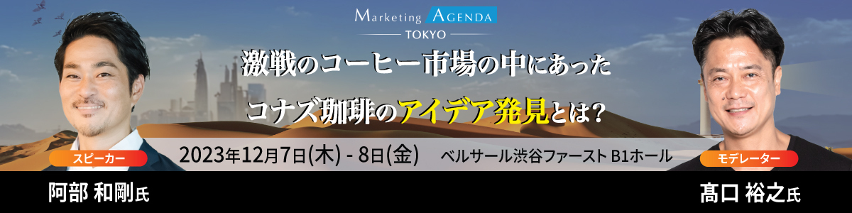 キーノートでは「激戦のコーヒー市場の中にあったコナズ珈琲のアイデア発見とは?」と題して、KONA’S 代表取締役社長 阿部和剛氏の登壇が決定した。モデレーターは、はなまる 企画本部 チーフマーケティングオフィサー(CMO)の髙口裕之氏が務める。