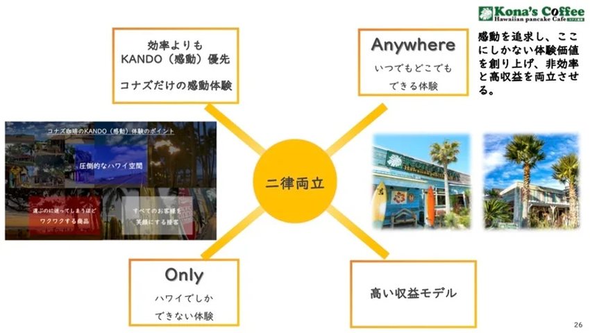 従来の店舗運営の常識に逆行する2つ目の成功事例は、KONA’S 代表取締役社長の阿部和剛氏がスピーカーとして登場、はなまる 企画本部CMOの髙口裕之氏がモデレーターを務めたセッションで紹介された、ハワイアンカフェ・レストランとして人気急上昇中の「コナズ珈琲」です。